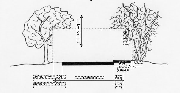 Mit Rücksicht auf die Belaubung der Bäume und Sträucher und dergl. im Sommer und den größeren Durchhang der Äste und Zweige erscheint es zweckmäßig die Maße des vorgeschriebenen Lichtraumprofils um jeweils 0,50 m zu erweitern.
